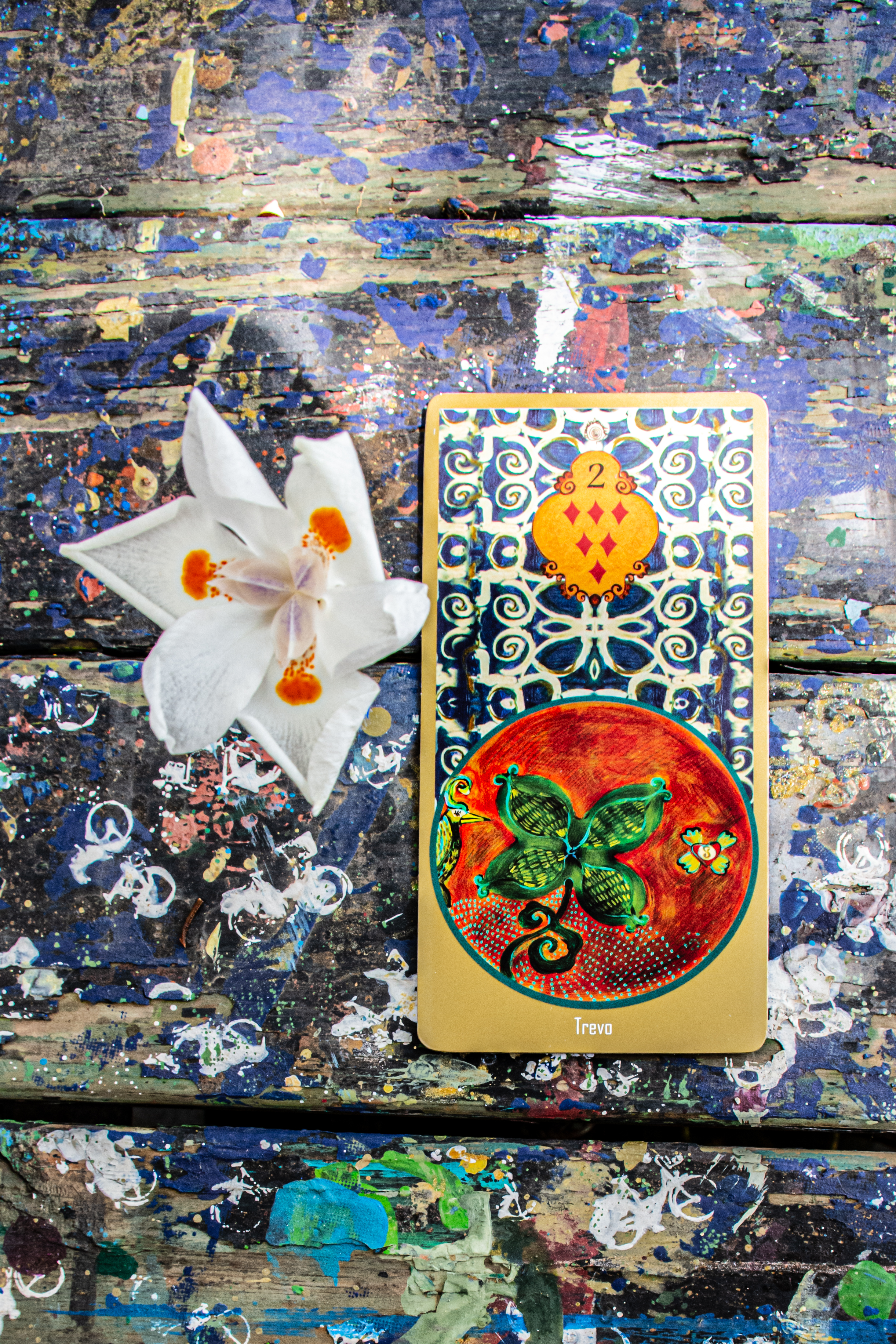 Carta 2 .O TREVO. Simboliza A Sorte. A segunda carta, o número 2 [6 de Ouros]. A sorte nas pequenas coisas. A sorte que caminha lado a lado com a alegria do viver o dia a dia, com presença e confiança em si mesmo. Aqueles momentos em que acionamos o Divino e entramos em harmonia /equilíbrio com o todo.