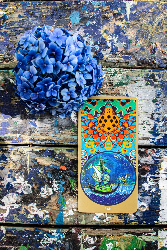 Carta 3. O NAVIO. Simboliza as águas internas, as emoções. A terceira carta, o número 3 (10 de Espadas). Reino de Netuno e Posseidon. Navegar é partida e também chegada. E viajar permite as variantes do tempo . O que levar? O que deixar? O que trazer? O que experienciar? O que adicionar? O que ressignificar?
