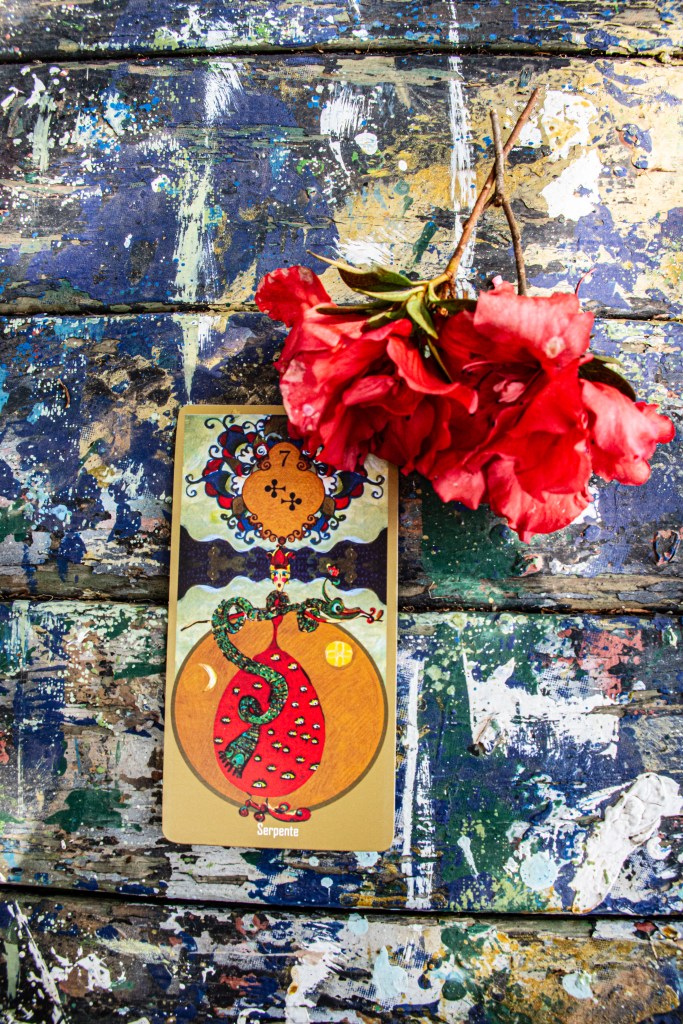 [Carta 7]. A SERPENTE. A sétima carta, o número 7 [2 de Paus]. Simboliza energia concentrada em paixão. O alerta é o cuidar do inesperado. A escolher para onde fixar a intenção do olhar. O Poder. Armazenar estratégias em recipientes que contenham os elementos primordiais em estados flexíveis, que podem dilatar-se ou contrair-se.