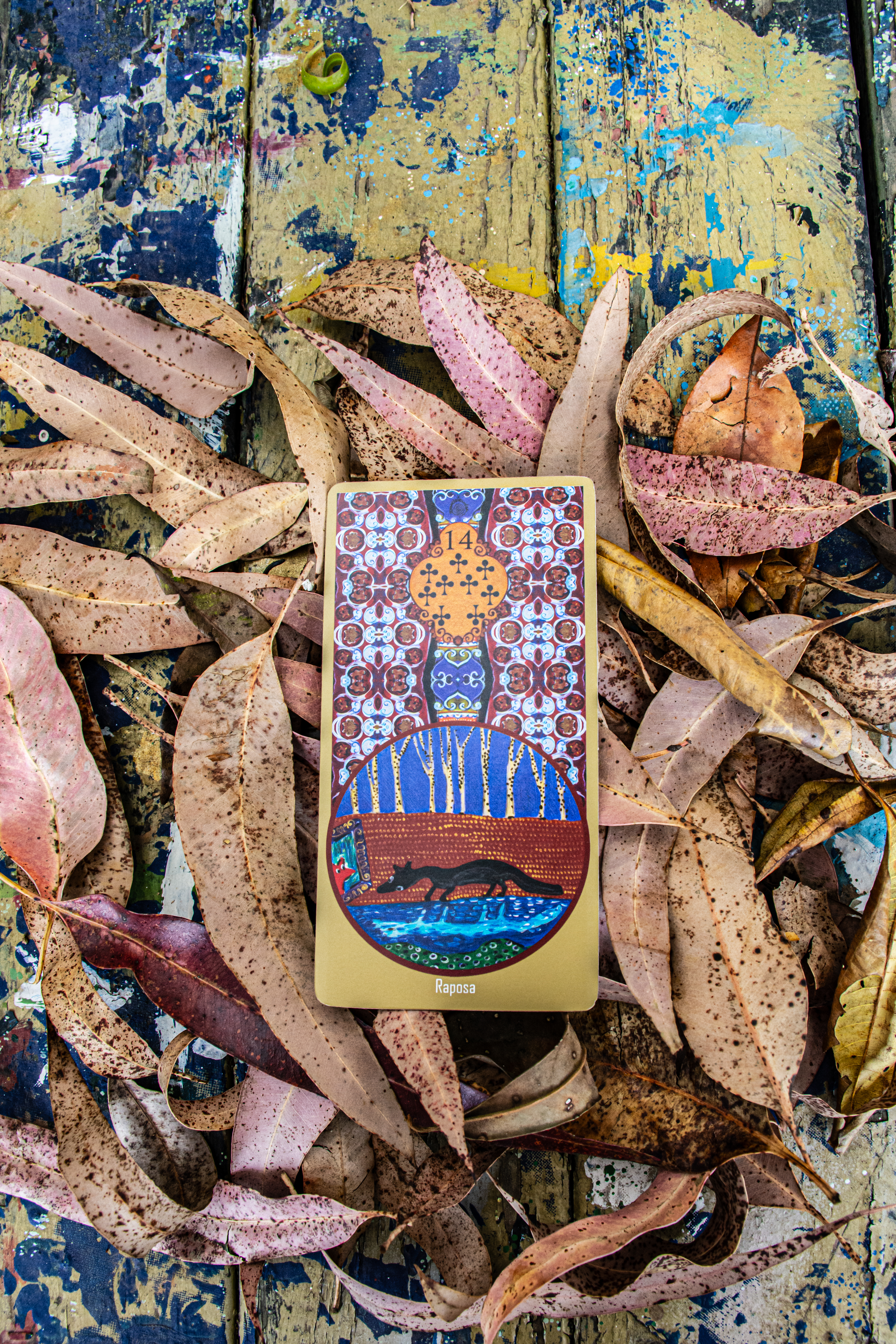 [Carta 14]. A RAPOSA. A décima quarta carta, o número 14 [9 de Paus]. Simboliza Alerta!!!!! Narciso encantado se espelha por toda parte. Esopo, em uma de suas fábulas, narra que a raposa ao não conseguir alcançar as uvas maduras diz que nao mais a interessavam porque estariam verdes. Eu sempre achei que a raposa, muito esperta, desdenhou porque tinha certeza intuitiva que outros vinhedos apareceriam pelo caminho e com parreiras frondosas mais acessíveis de desfrutar. 14 poderia também ser um 5[1+4] para conquistar o modo observador e aventurar-se a lidar com as multidimensionalidades.