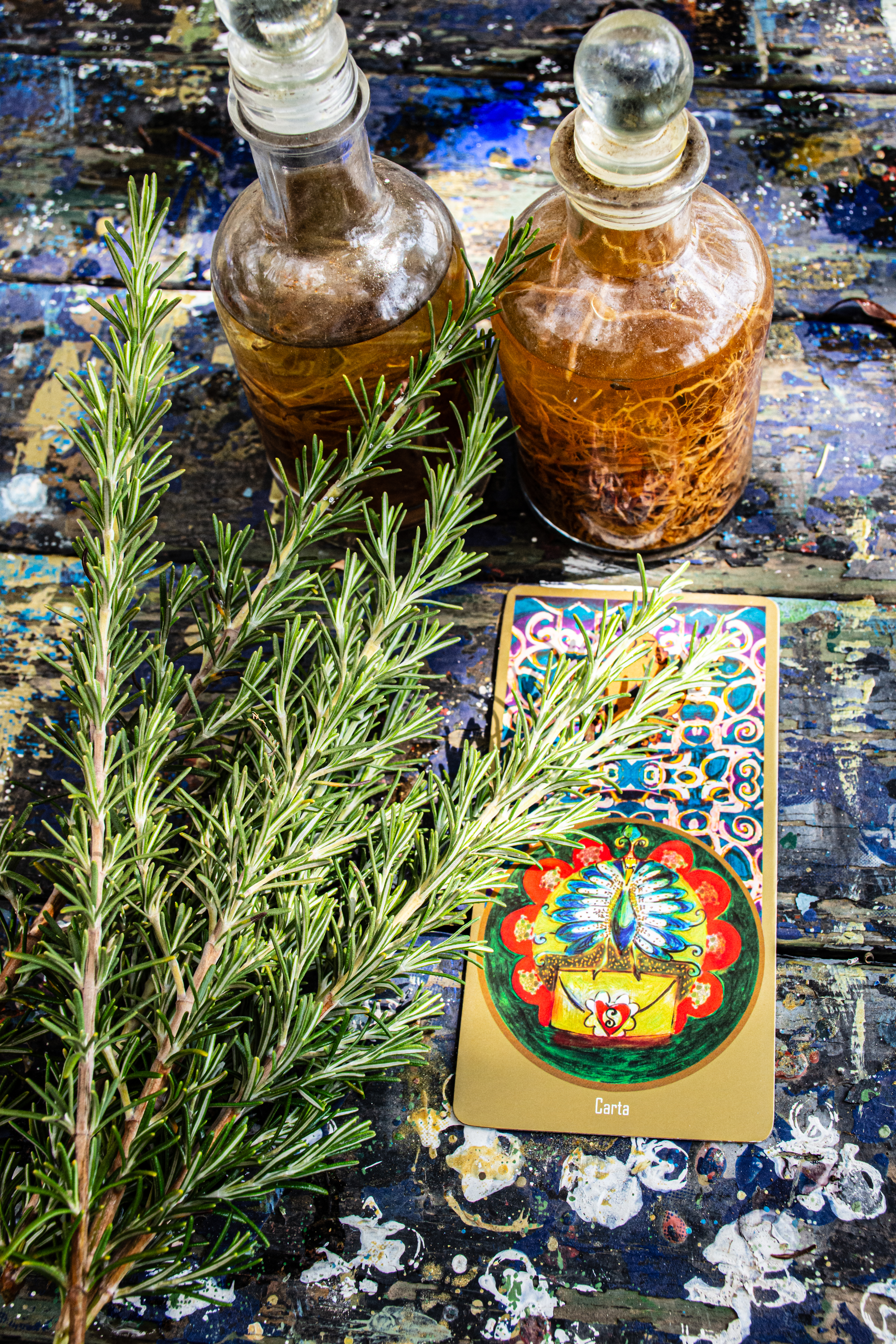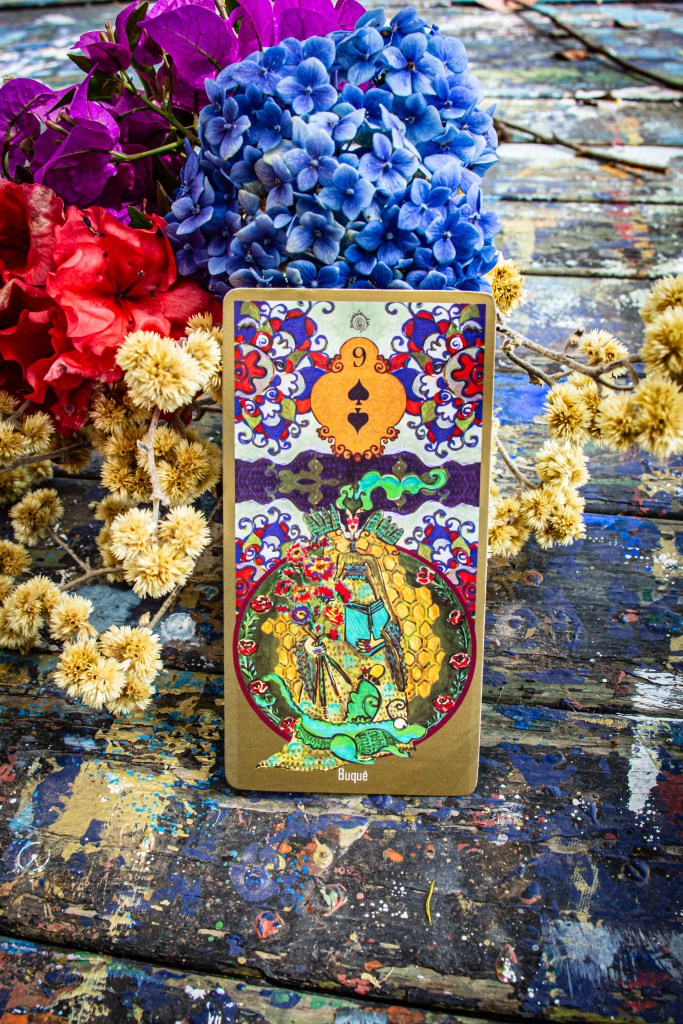 [Carta 9].O BUQUÊ. A nona carta, o número 9 [2 de Espadas]. Simboliza a força criativa pronta a emergir. Como as flores, há de ser e perceber o sutil para receber o orvalho. E colorir a vida, onde o contínuo estado de presença faz -se ABRACADABRA e fixa as tonalidades translúcidas.