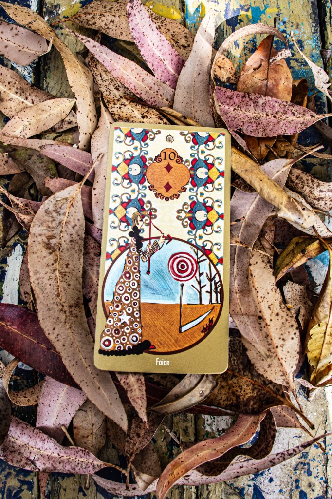 [Carta 10]. A FOICE. A décima carta, o número 10 [2 de Ouros]. Simboliza corte e [ou] colheita. Tudo está pronto e é manifestado. – 1234567890- . A partir de agora, o jogo se apresenta com mais escalas nas tonalidades. A combinação de dois números requer ser aprendiz e mestre ao mesmo tempo.