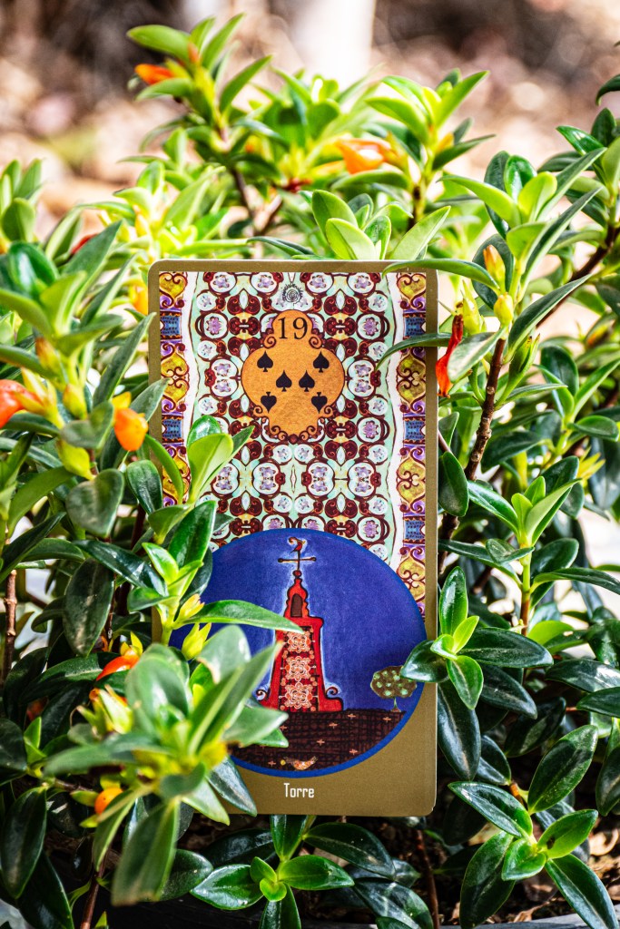 [Carta 19].A TORRE. A décima nona carta, o número 19 [6 de espadas] . Simboliza o “self”. A longevidade a ser conquistada. Construir castelos, com quantas janelas e portas? Que tipo de estrutura vou buscar e conectar? Pedra, tijolo, madeira, papel, ar, fogo, terra, água, sons, fractais, frequências, cristais, lasers, plasmas? A liga dos elementos afins coordena e revela o destino. Se olhamos para além do castelo, existem paisagens a surpreender. 6 de espadas diz sobre manter o equilíbrio e ter a lógica e a intuição. 19 será 10 [1+0], quando o vazio é conscientemente o todo preenchido.