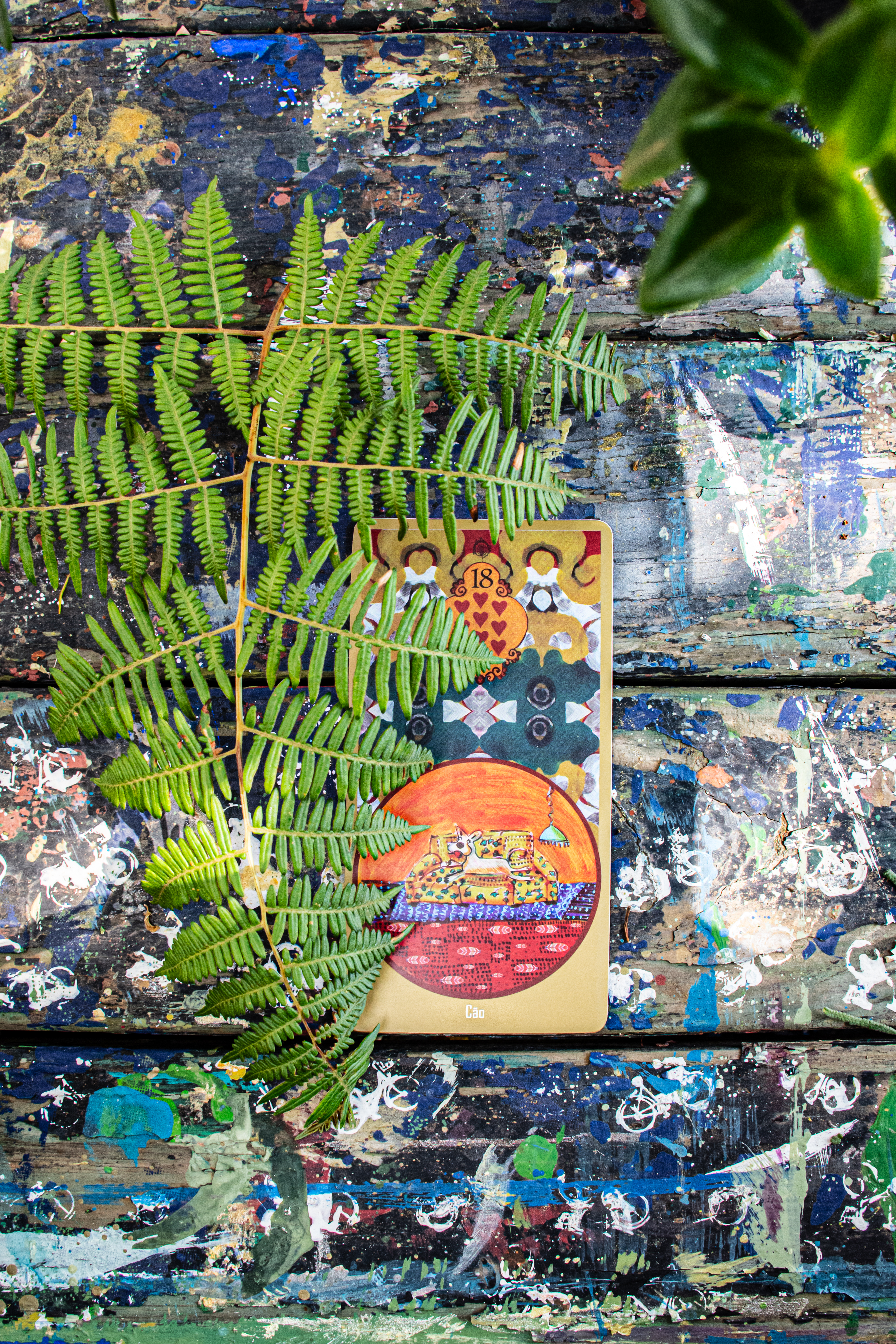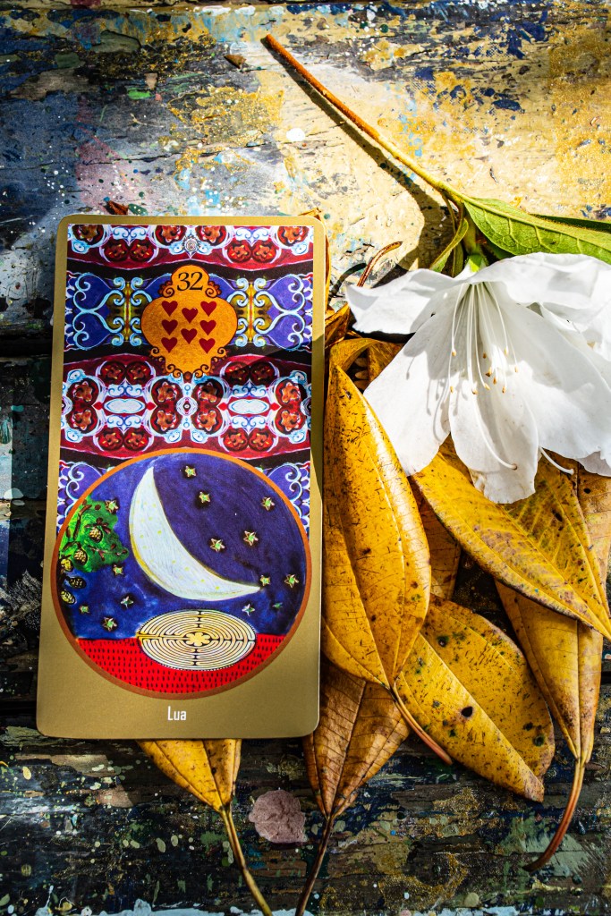 [Carta 32]. A LUA. A trigésima segunda carta, o número 32 [8 de Copas]. Simboliza os movimentos sutis. As dimensões visíveis do tempo: Tempo de planejar e iniciar- lua nova. Tempos de atuar – lua crescente. Tempo de brilhar – lua cheia. Tempo de analisar e finalizar- lua minguante. E outra vez e repetidamente.. A lua lê a sombra e a luz. Serenidade e ação. As marés, nossos corpos, nossas águas internas- os estados de influência e constante conexão. Observe: O sol – o labirinto é Ser/Estar. A Lua – o labirinto é Espelho. 32 é comunicação. Quando 5 [3+2] redireciona ao mundo das possibilidades, 8 de Copas convida a seguir em frente e estar aberto a mudanças de rotas.