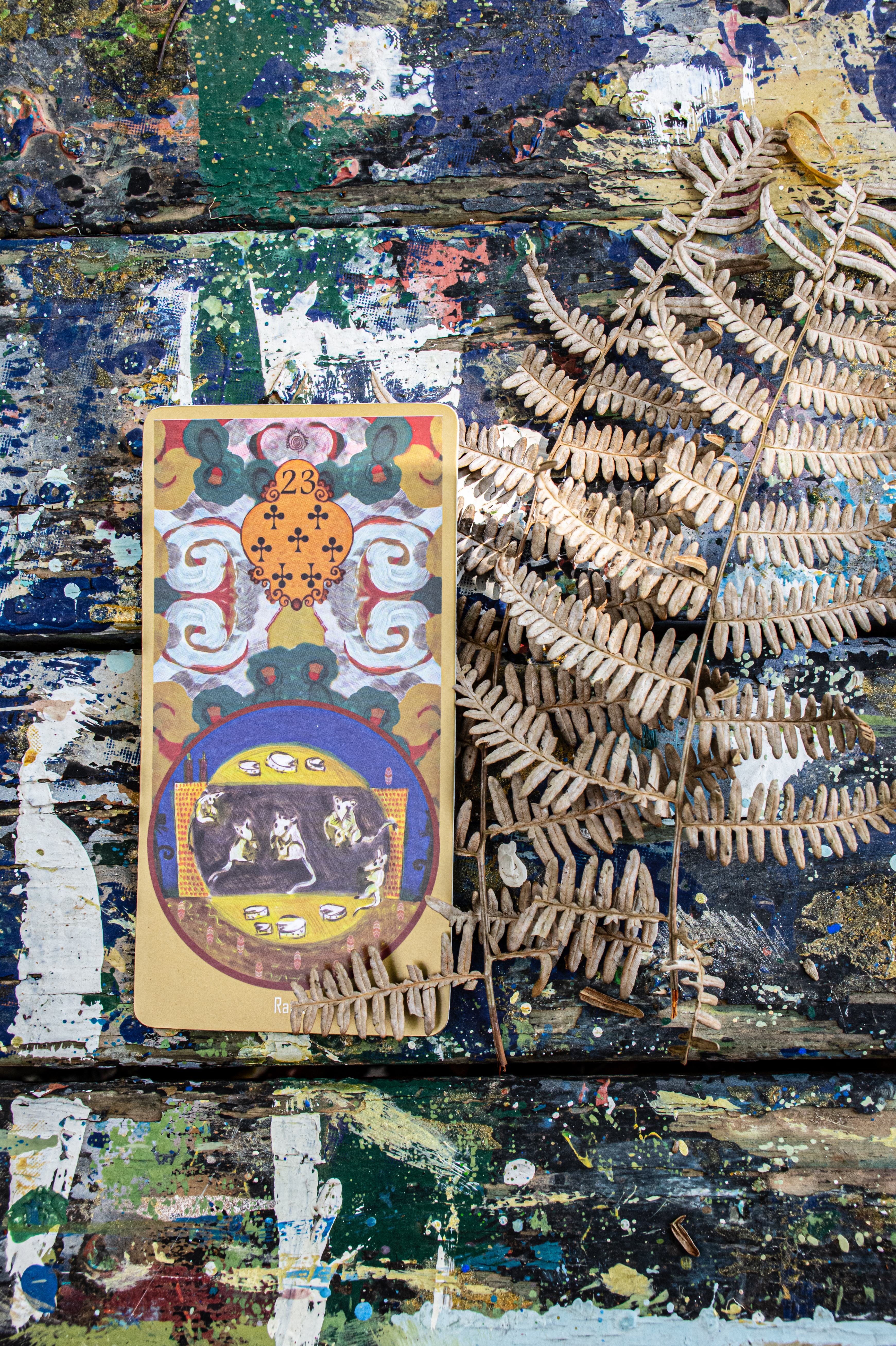 [Carta 23]. OS RATOS. A vigésima terceira carta, o número 23 [7 de Paus]. (Os ratinhos, estes que nos alerta!!!) Simboliza revisão das escalas de frequências. O que se perdeu e não foi percebido? Onde a energia está sendo posta? Hora de rever e reverter o caos, cuidando e organizando os detalhes do dia a dia. Porque em 23 temos um número de recompensas, sorte e sucesso. Em 5 [2+3], todas as possibilidades presentes.7 de Paus, a coragem e ferramentas para lidar com os desafios.