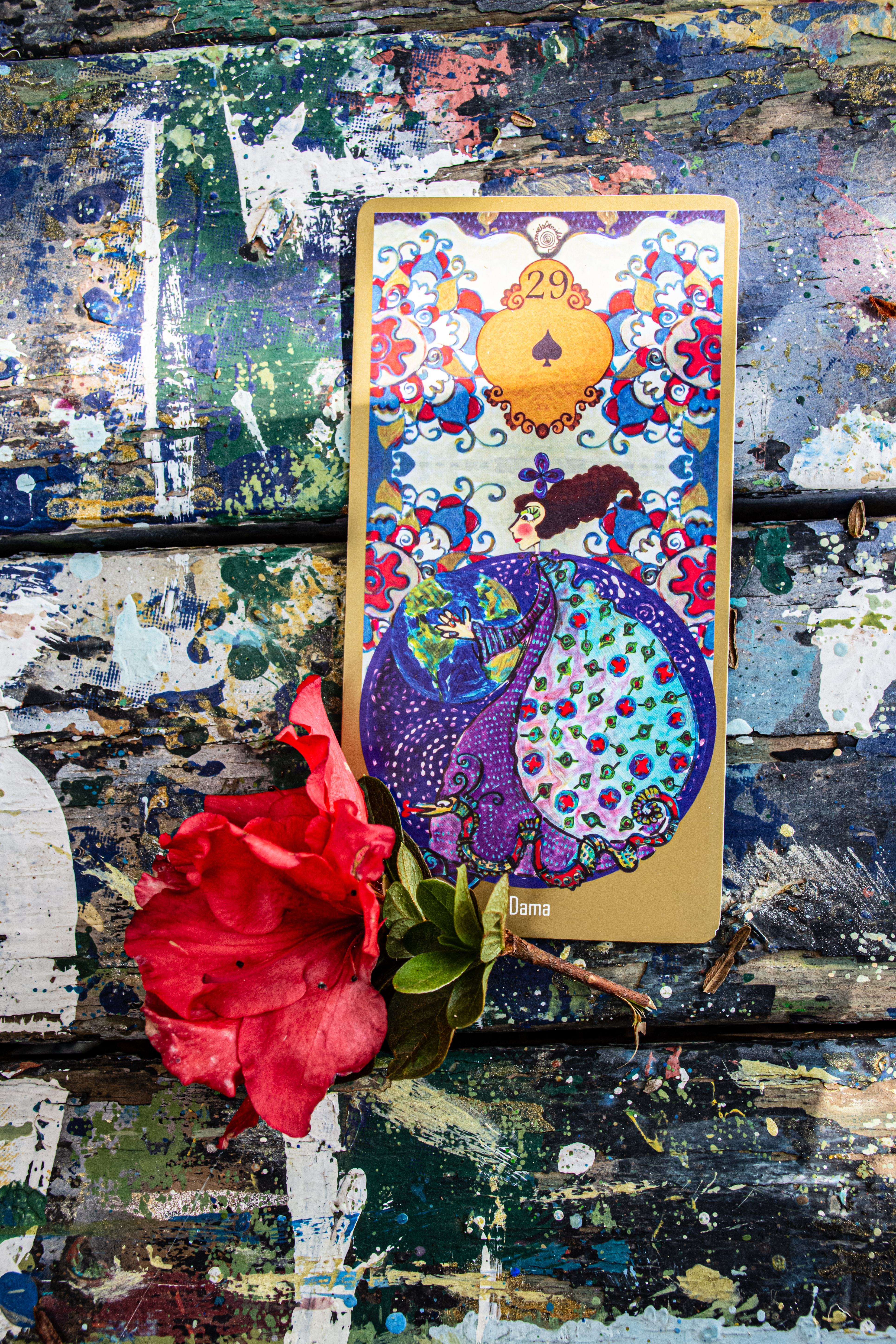 [Carta 29]. A DAMA. A vigésima nona carta, o número 29[Ás de Espadas]. Simboliza a energia feminina. A força Yin, lunar. Cada ser carrega um mundo próprio para criar e compartilhar simbioses em micro e macro universos. A presença no agora é chave mestra para decorrer o “fio de Ariadne “que possibilita transitar com consciência nos labirintos que compõe o tecido cósmico. 29 é desafio e enquanto 11 [2+9] se torna número mestre indivisível. Ás de Espadas abre clareza e comunicação.