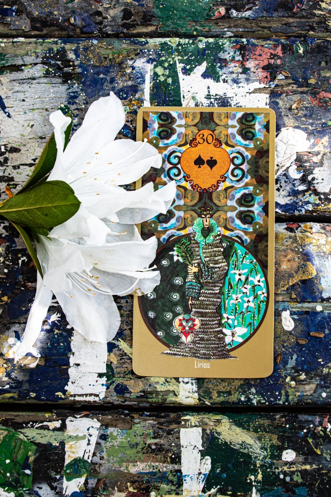 [Carta 30].OS LÍRIOS. A trigésima carta, o número 30 [o Rei de Espadas e o 2 de Espadas]. Simboliza sabedoria e renovação. A serenidade para escolher o caminho.. A visão de longo alcance. 30 está em sintonia com 3[3+0] que perspectiva o desejo de transformar. Alerta: Rei de Espadas gosta de se vestir de poder intelectual e experiência de vida. Dois de Espadas diz que a escolha é o mistério que reina – dizer sim ou dizer não. Vai depender de quanto de intensidade [e] coragem [e] sorte [e/de] desejo a conquistar.