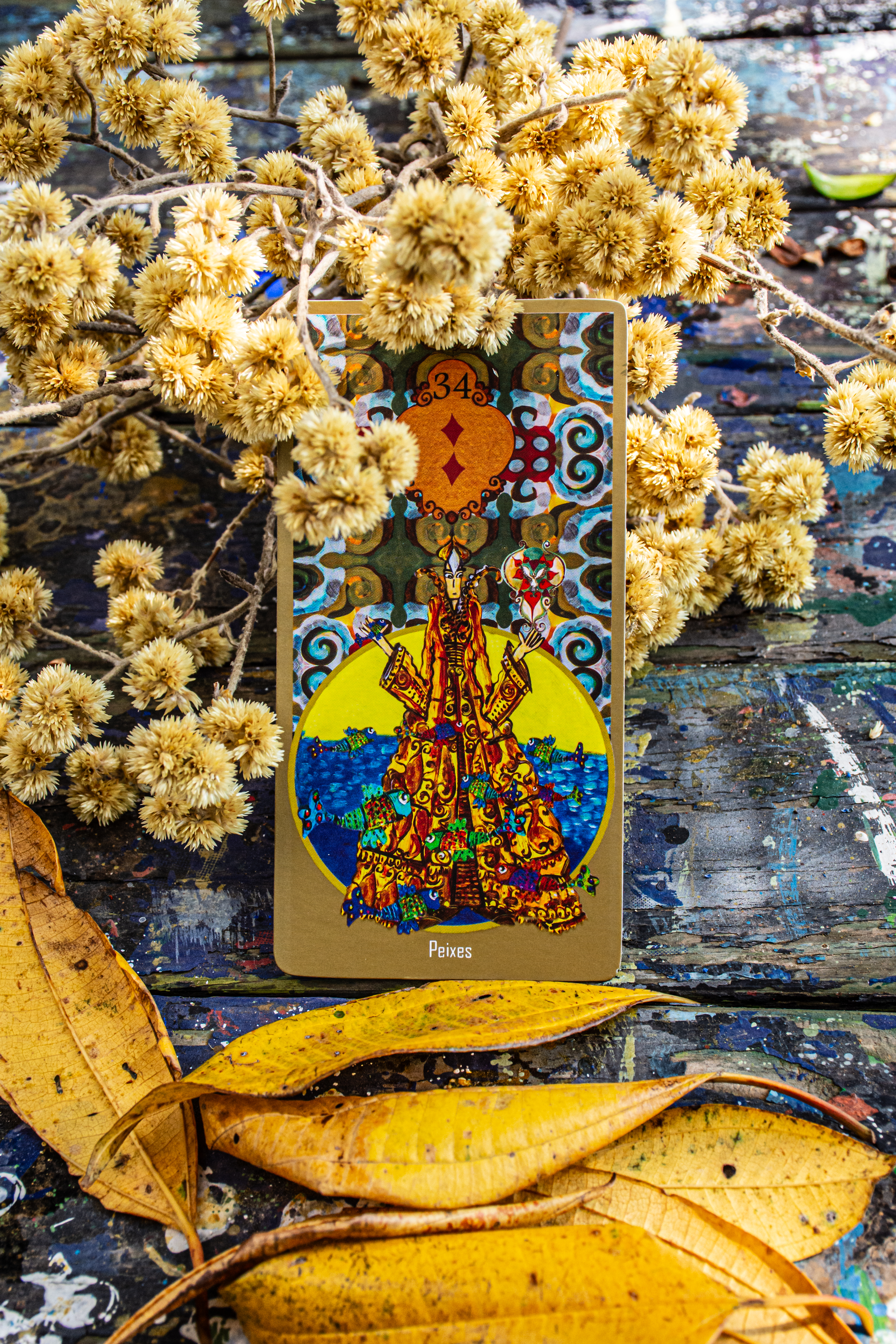 [Carta 34]. OS PEIXES. A trigésima quarta casa, o número 34[Rei de Ouros]. Simboliza a abundância. A prosperidade que chega e multiplica. Aqui o alerta é Midas – o que tocar vira ouro – o zelar pelas palavras que são força criadora. 34 é número sorte e quando 7[3+4], acessa sabedoria com fartura.