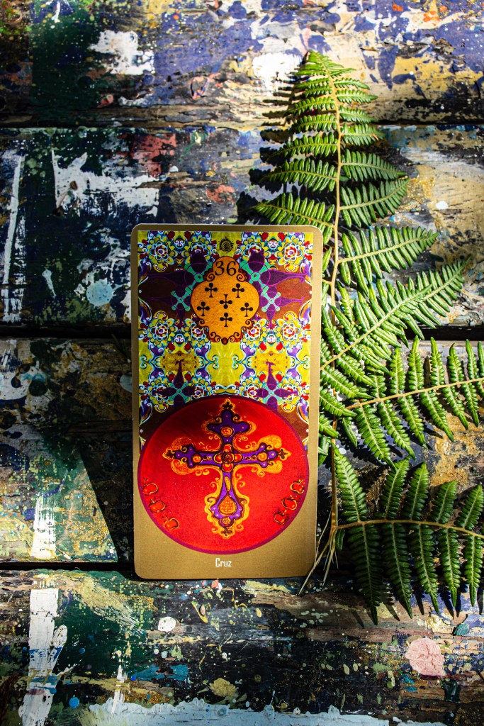 [Carta 36]. A CRUZ. Representa as transformações. A trigésima sexta carta, o número 36 [6 de Paus] e a última carta do Oráculo. Metamorfoses, nasce e renasce, cria e recria, termina e começa. 36 combina 3+6 em 9 que realizou todo o percurso para logo novamente reiniciar e dar continuidade a cocriação de um existir. O 6 de Paus diz que estamos no caminho correto, mas que ainda teremos muito que andar. Siga com confiança!