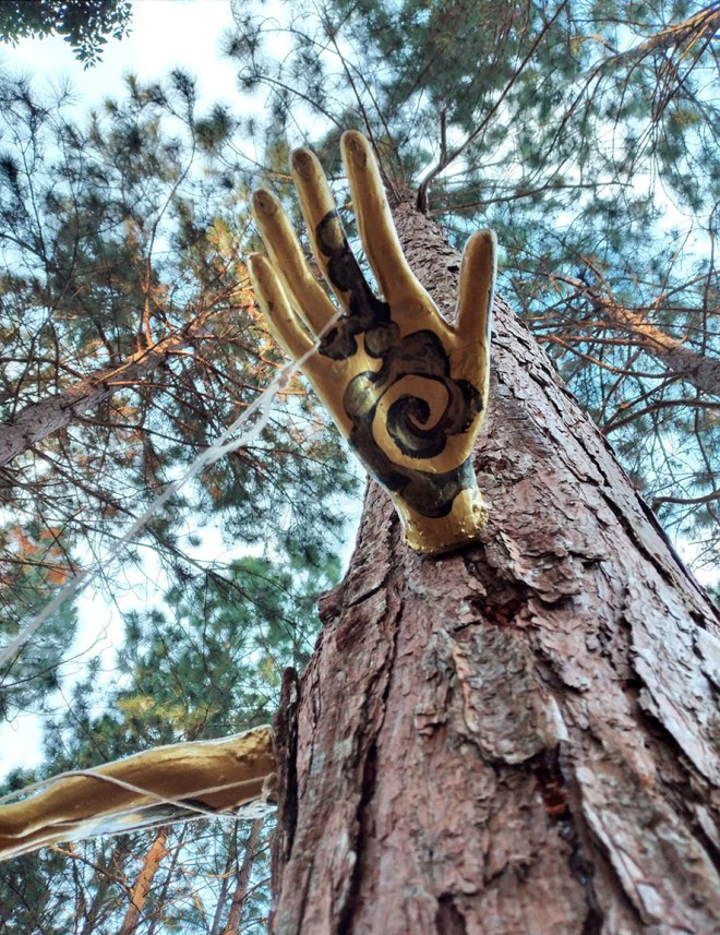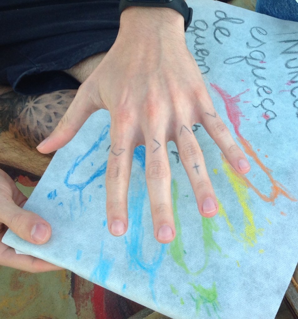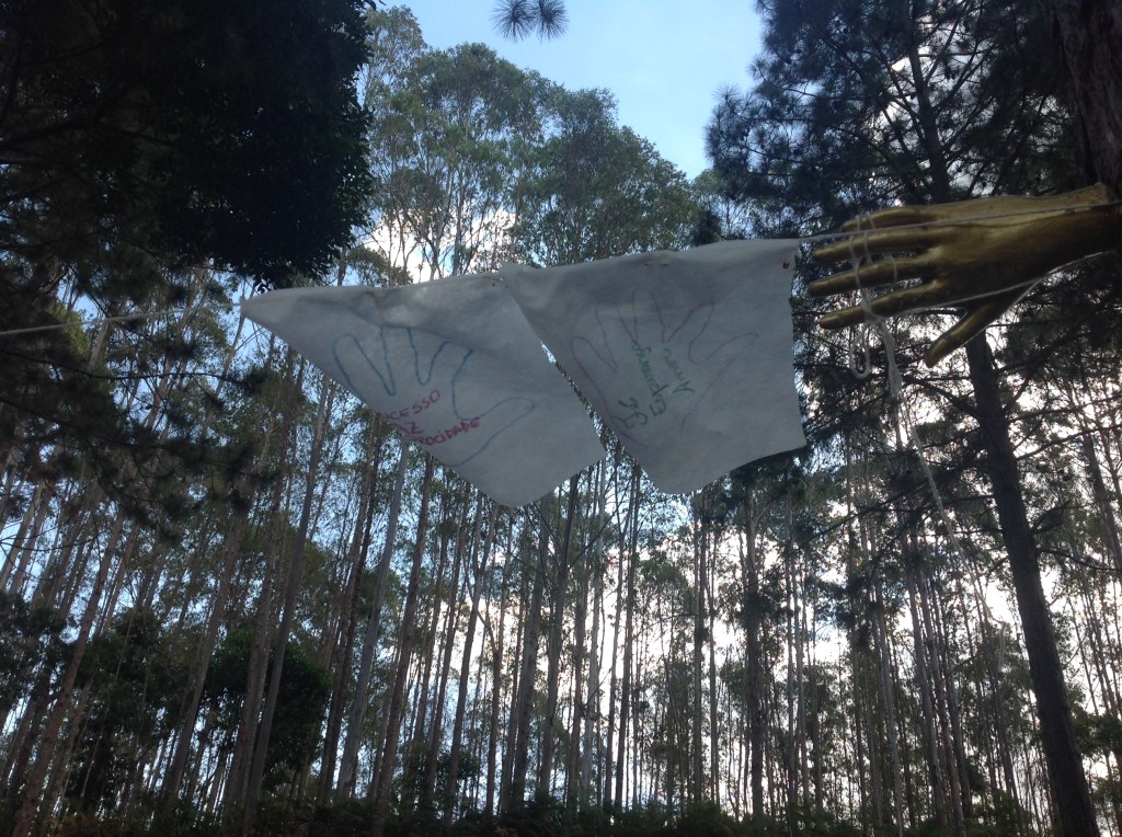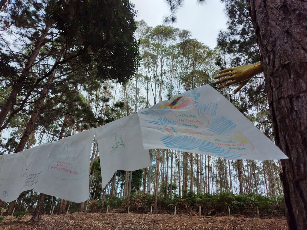 Um convite a entrar na obra – como um “tapete mágico” – decalcar a mão esquerda e escrever 3 palavras – o desejo do “agora”, para gerar códigos a formatar o futuro.