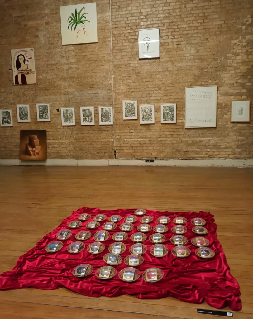 A Tenda – Instalação – Pinturas ( corantes reativos e acrílica s/tela), em dimensões variadas, dispostas em forma de tapetes superpostos que formam paredes, chão e parte do teto. Obras que atuam únicas ou em conjunto. Dimensionam a síntese de memórias das cartas, utilizando os números como elementos de dinamização.